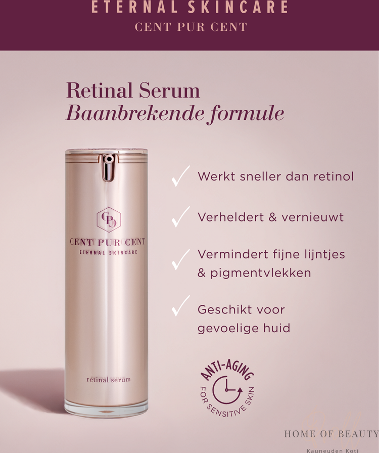 Cent Pur Cent Eternal Retinal Serum on tehokas, ihoa uudistava seerumi, joka perustuu retinaliin, bakuchioliin ja antioksidantteihin.