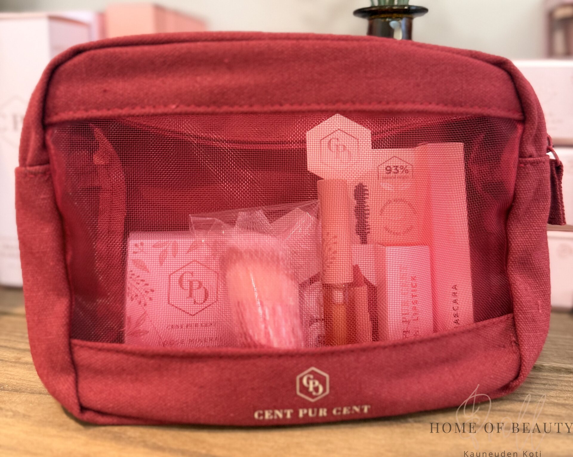 Tuotteet on pakattu punaiseen, kankaiseen meikkilaukkuun: